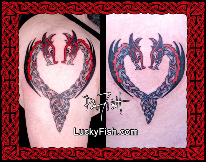 Two Nordic dragons gaze contentedly at each other, representing the happily married couple who requested this custom heart-shaped pattern and got it to celebrate their 20th wedding anniversary. The knotwork and overall pattern form a symbol of gentle hearts, united as one.