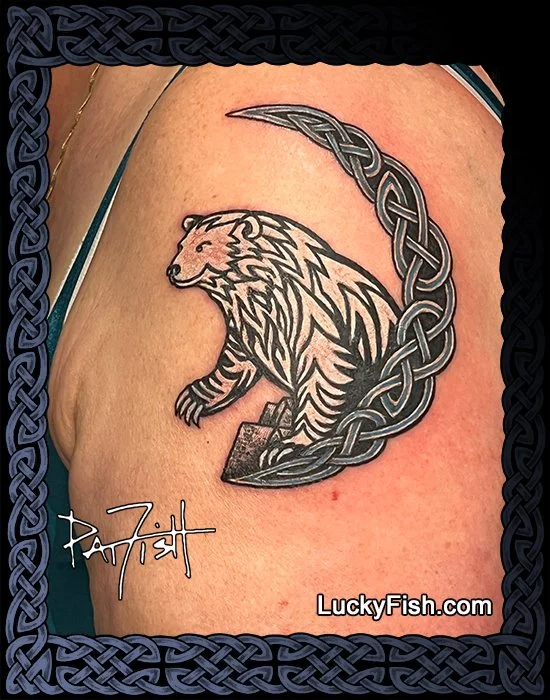 A fulfillment of a vision. This woman lost a trisomy baby at birth, and in dreams she comes back to her mother as a spirit bear, a loving polar bear. We placed her on a Celtic crescent moon, with icebergs, reaching out to comfort her. I love my job, bringing heart felt visuals to life in skin.