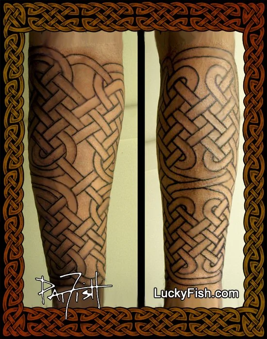 Chainmail Tattoo for Forearm with Celtic Design August 21, 2025 One of the most impressive ways to use Celtic knot work is to cover a whole body part, like a fore-arm, with one connecting pattern of weaving lines. This is just such a design, that creates an effect like body armor, a warrior's chain-mail.