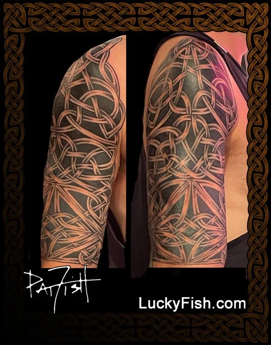 This extensive Celtic body armor knotwork tattoo is one continuous weave, several knots fully integrated together into one pattern, flowing from the neckline down to the middle of the upper arm where it forms a complete band. A warrior's tattoo to carry with him into battle wherever his fortunes may lead him.