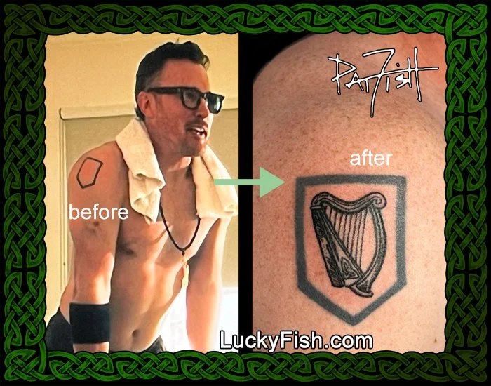 This Irish actor wore an empty shield on his arm for a decade, as evidenced by this screen capture from his latest film PRETTY MISS LOLLY. He just couldn't make up his mind what to put in it. Finally this week he did the obvious and had me put a little Irish Gaelic harp in it !
