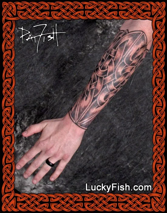 Bracers were worn on the archer's forearm, and had two uses. The first was to protect the forearm from the bowstring, and the other was to keep any loose sleeve material out of the path of the string. An essential piece of equipment in battle, this tattoo design gives the same feel when placed on the forearm, ready at all times to meet whatever the vagaries of fate may deliver.