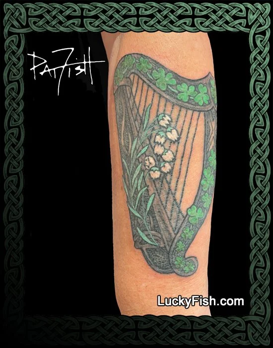 Harp Tattoo Design with Celtic Shamrocks and Bog Rosemary