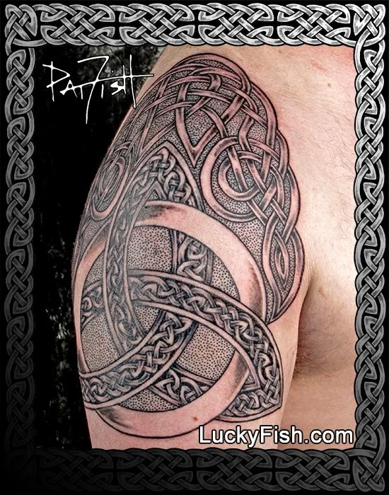 Dramatic upper arm coverage is achieved with this combination of integrated patterns. The central piece is a knot work trinity knot, weaving in and out of an eternal circle. Fitted in above it is a knot work epaulette that makes a sculptural statement, flowing up onto the shoulder. Tying the elements together in this rendering are pointillist dots, giving a textural feel and bringing the knots forward visually. They make the pattern feel united as one.