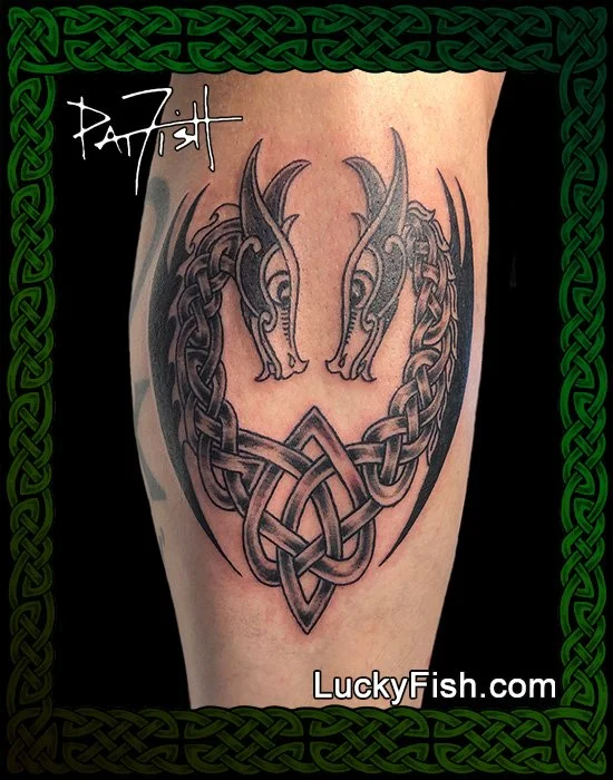 A combination of Nordic style dragon heads with Celtic knotwork to make an overall heart-shaped silhouette. The knots in the necks are similar but not identical, so the dragons are balanced and complementary but not mirrored. Like a happy marriage, they are individuals within a One.