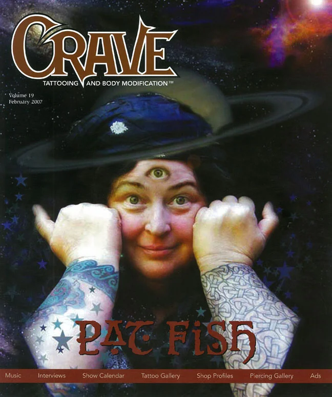 Pat Fish: I had been making my living as a journalist and I'd supply drawings to go with my articles. I found that I liked the art part best, so when I turned 30 I looked about for a way to do art full time. Tattooing seemed like the most legitimate art form available. It requires you to do your best every time, it really MATTERS to the person commissioning the piece, and I could continue my life-long committment to self-employment. I like it that the artist is in direct contact with the client, and that it isn't for "investment value" or resale. The power tattoos hold is in their importance and relationship to the wearer. Every person is different, every commission tests my ability to listen to what they say they want and then work with them to achieve that in skin. So I contacted Cliff Raven and got my first tattoo, and with total hubris showed him my portfolio and asked him to teach me, which he graciously agreed to do.